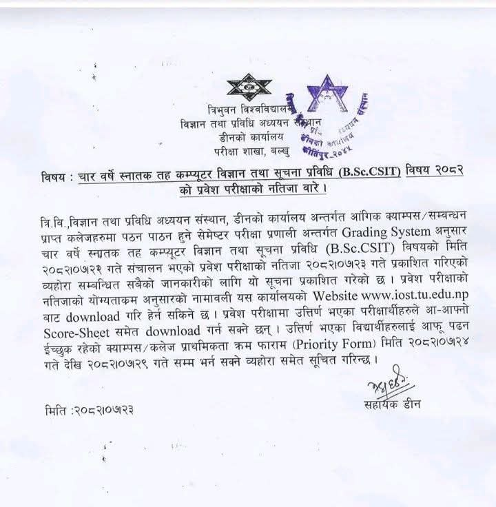 Tribhuvan University, Institute of Science and Technology Studies (IOST), Dean's Office Examination Section, Balkhu has published the results of the entrance examination for the four-year Bachelor's in Computer Science and Information Technology (BSc. CSIT), conducted on Kartik 22, 2082.