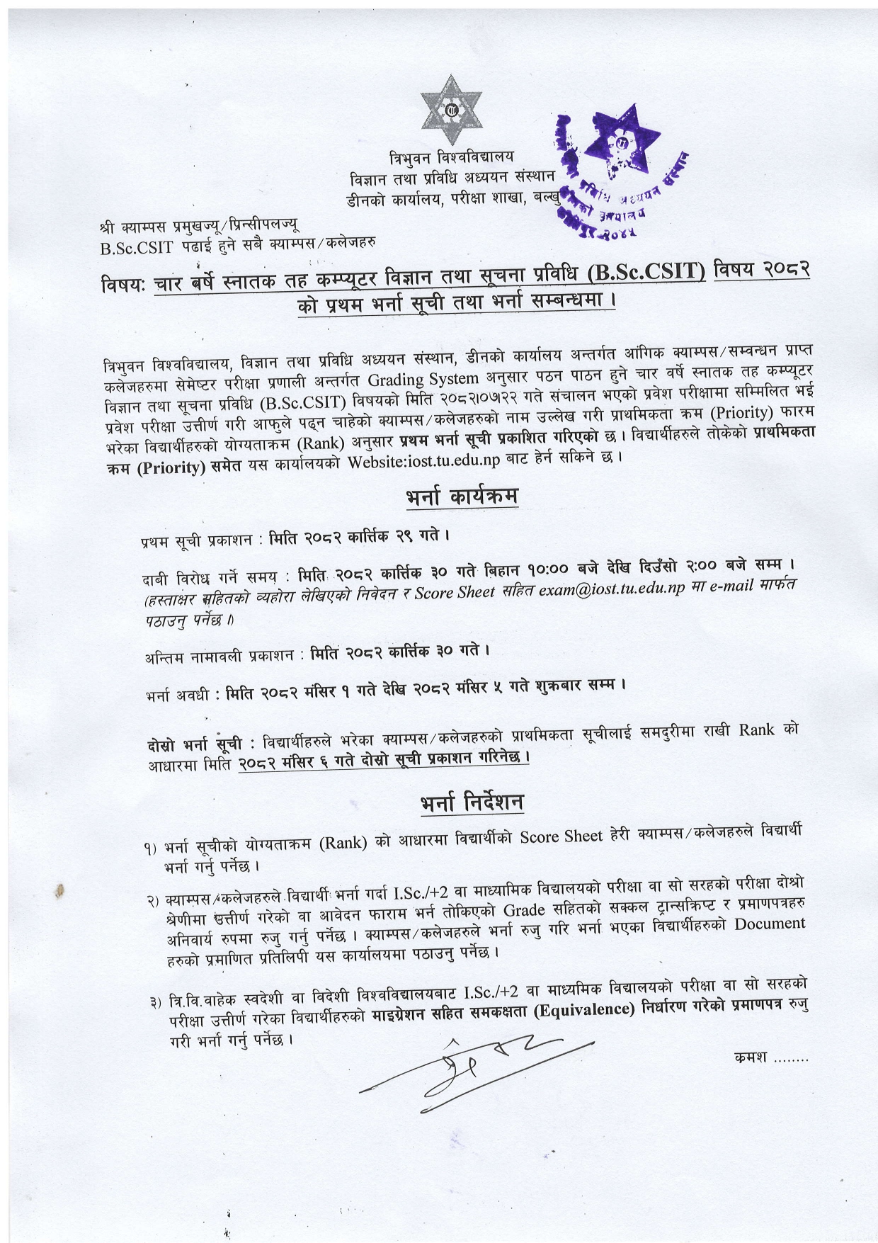 Tribhuvan University, Institute of Science and Technology, Dean's Office, Examination Department, Balkhu, has published the priority list for BSc Computer Science and Information Technology (BSc CSIT) 2082 with the students who have filled out priority forms. The entrance examination was held on Saturday, Kartik 22, 2082 (November 8, 2025).