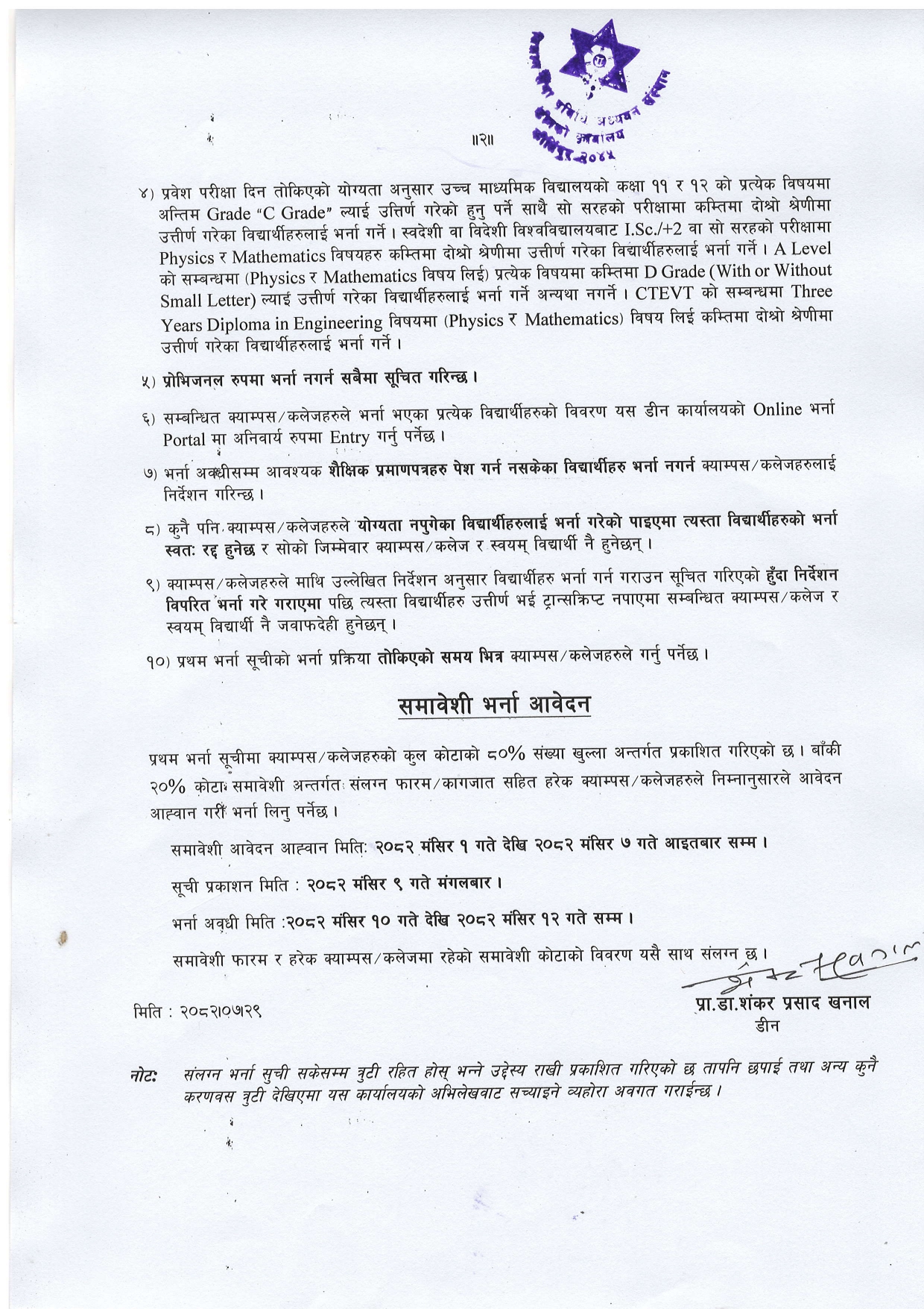 - Admission Period: Mangsir 01, 2082 to Mangsir 05, 2082 (November 17, 2025 to November 21, 2025)