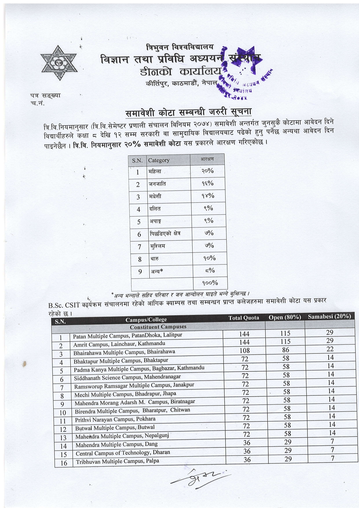 Tribhuvan University’s Institute of Science and Technology Studies, Office of the Dean, has announced that students who passed the B.Sc.CSIT entrance examination held on Kartik 22, 2082, but did not fill the priority form, may still apply for admission under the inclusive quota. This applies to students of affiliated campuses and colleges, in accordance with Tribhuvan University regulations.