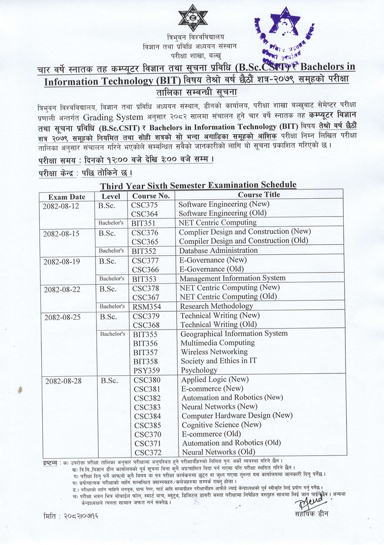 Tribhuvan University, Faculty of Science and Technology, Dean's Office, Examination Department, Balkhu, has published the sixth-semester examination routine of BSc. Computer Science and Information Technology (BSC. CSIT) for regular and partial examinees.