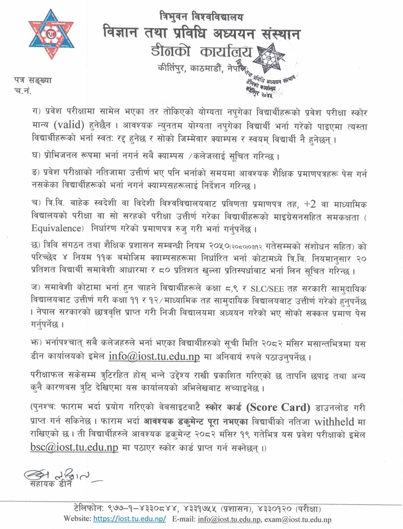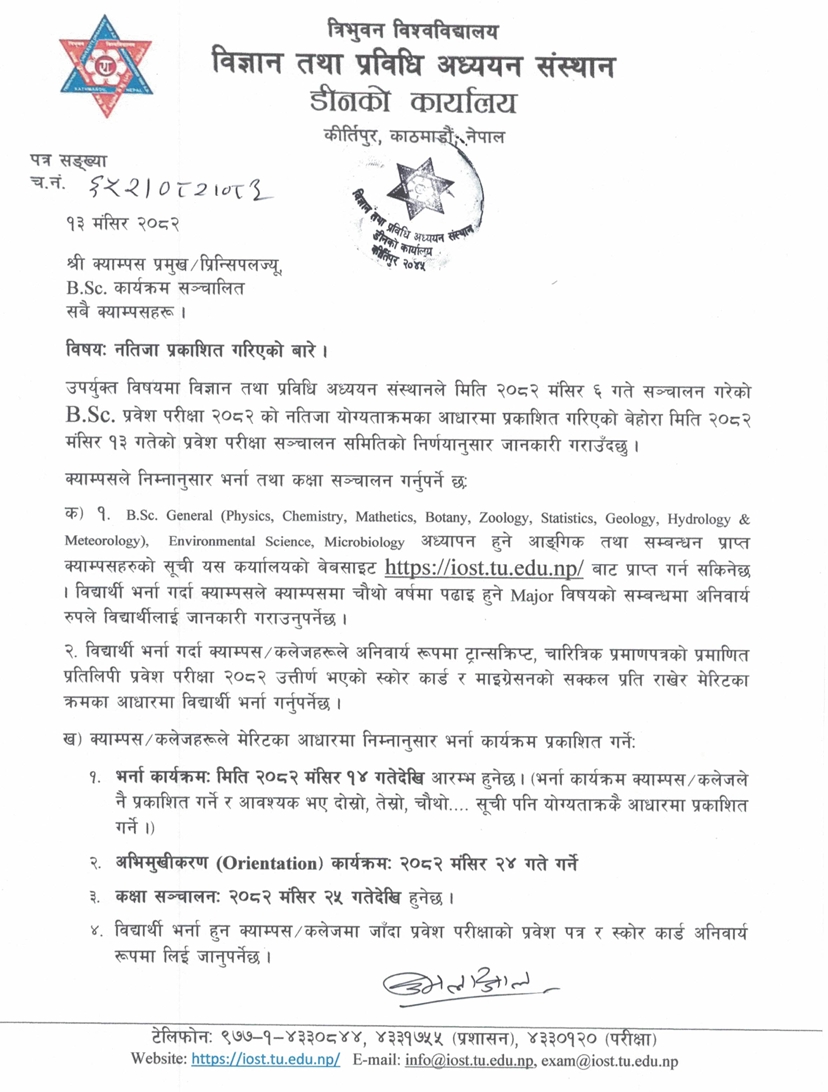 Tribhuvan University, Institute of Science and Technology (TUIoST), Office of the Dean has published the entrance examination result of BSc 2082.