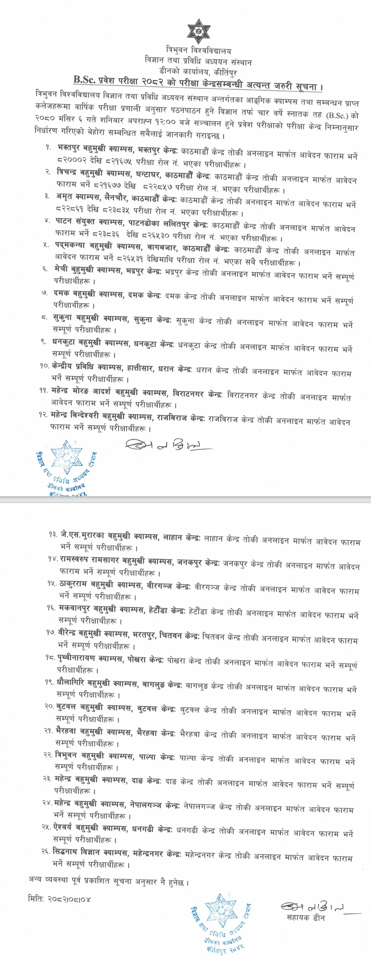 Tribhuvan University, Institute of Science and Technology, Dean's Office has published the examination centers for the entrance examination of the 4-year BSc program for the academic year 2082.