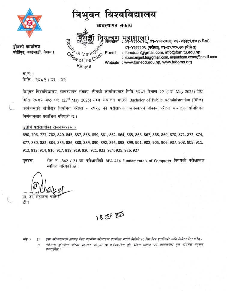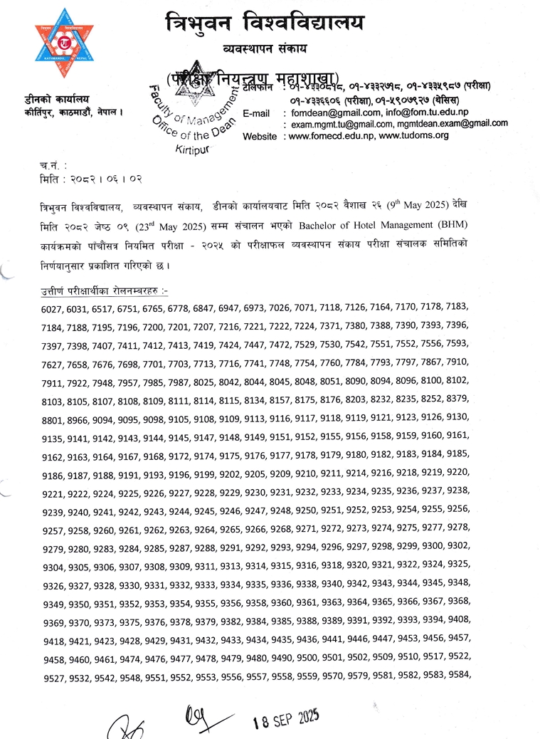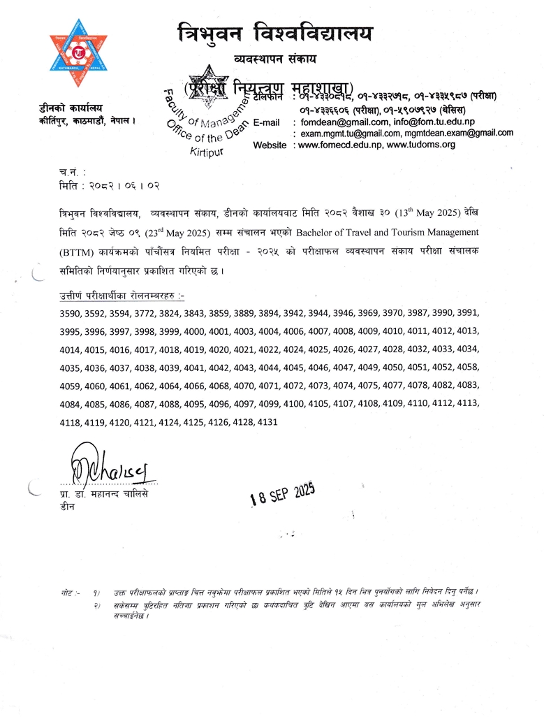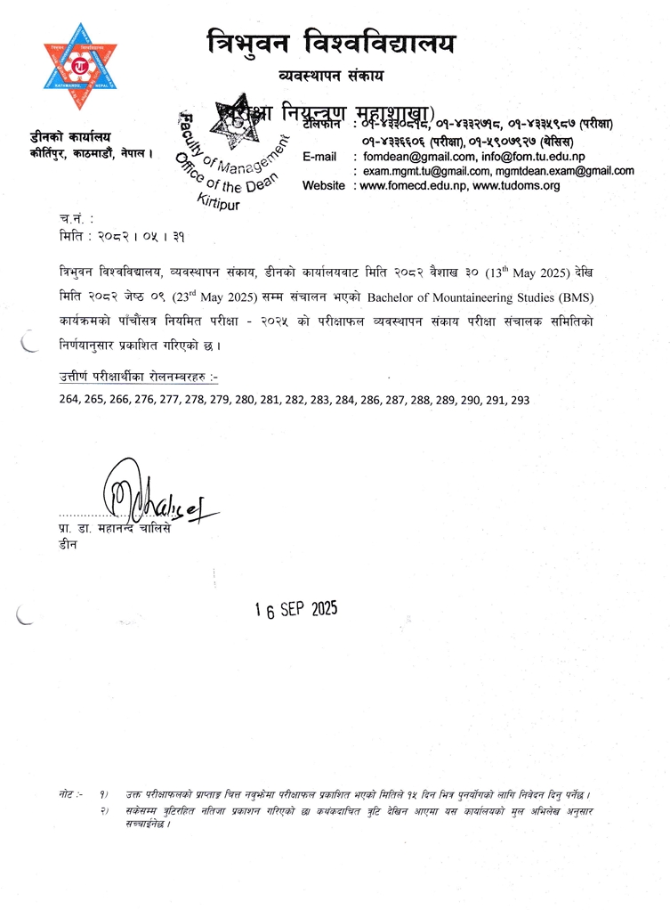 Tribhuvan University, Faculty of Management, Examination Controller's Division, Dean's Office, Kirtipur, has published the fifth-semester examination results of the following programs: