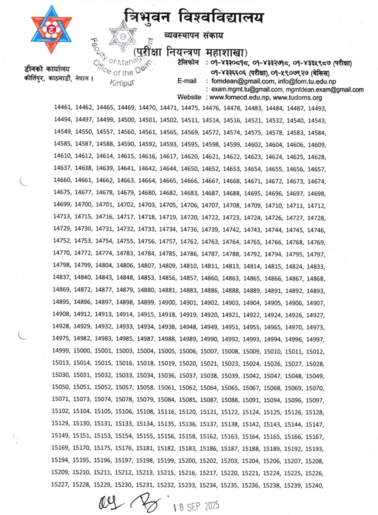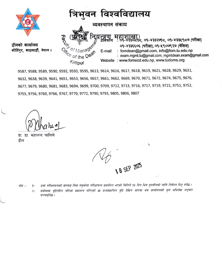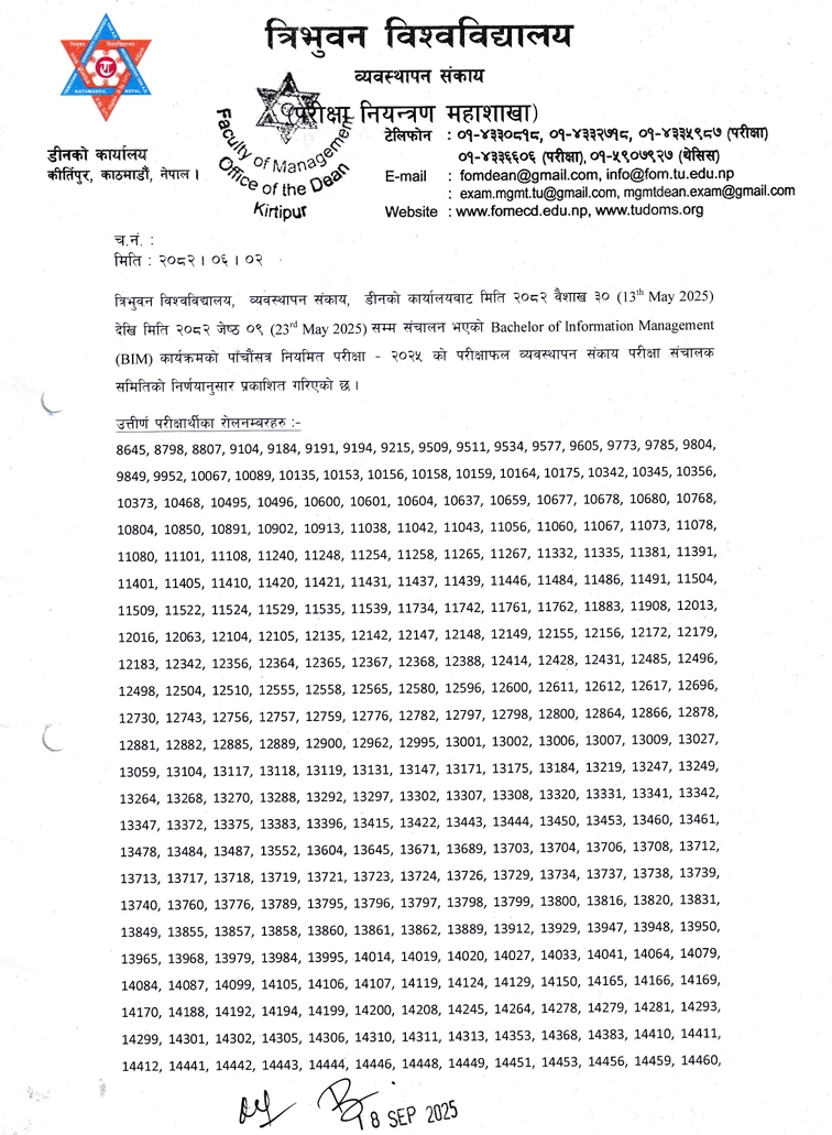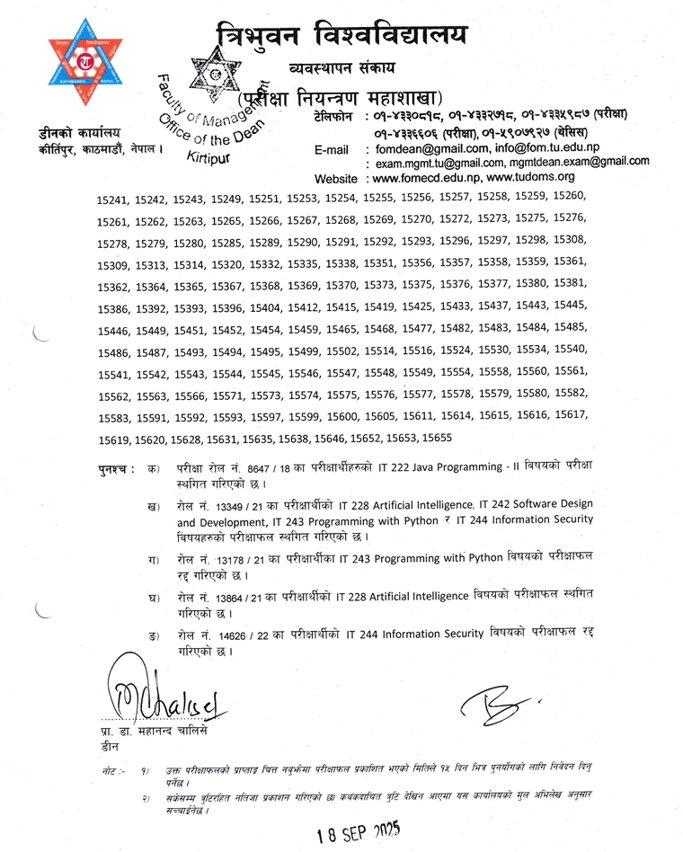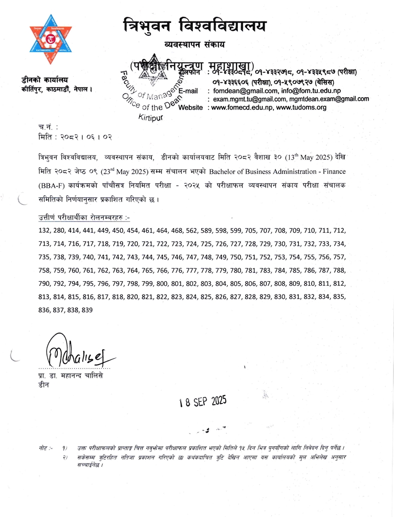 Tribhuvan University, Faculty of Management, Examination Controller's Division, Dean's Office, Kirtipur, has published the fifth-semester examination results of the following programs: