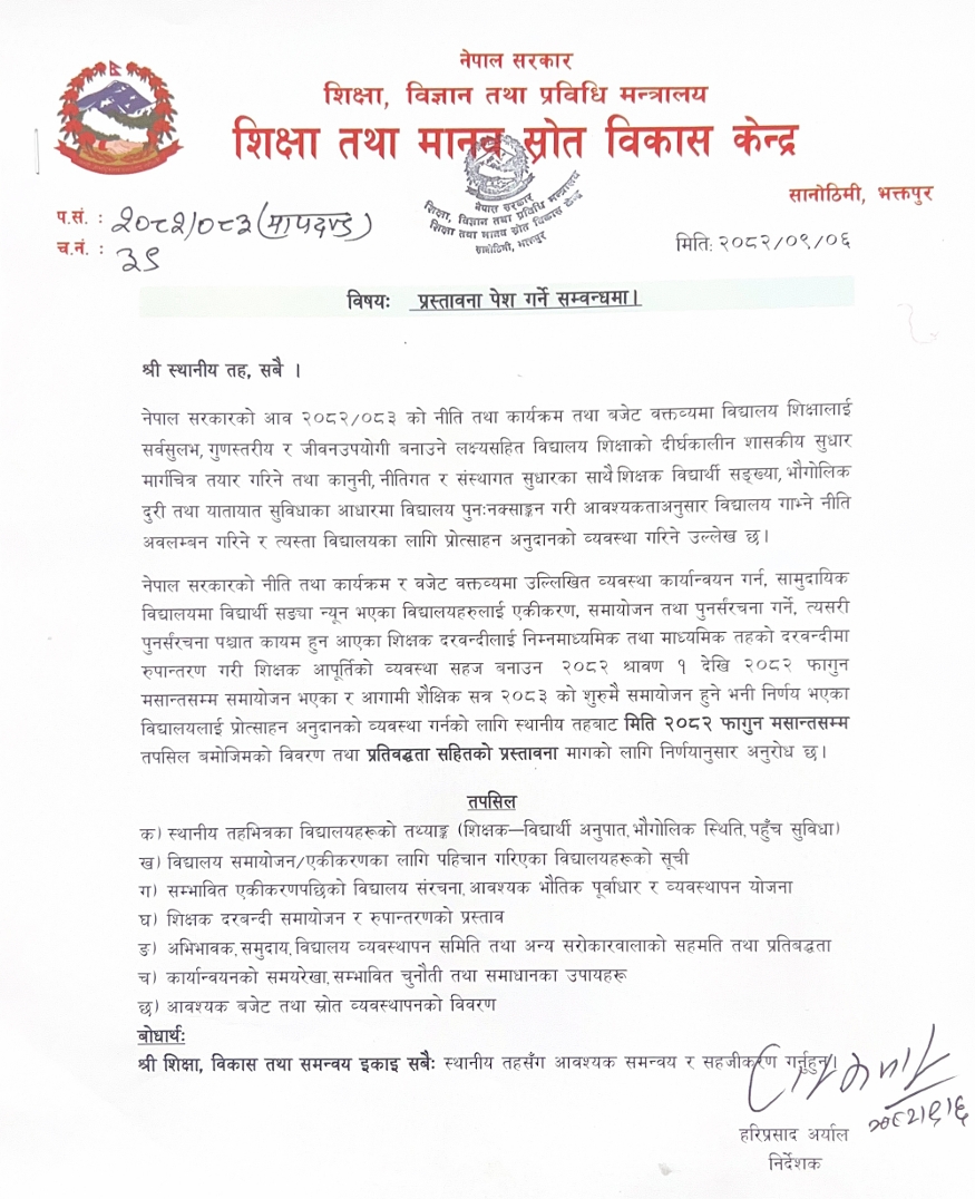 The Centre for Education and Human Resource Development (CEHRD) has issued a significant notice directing all local levels to submit detailed proposals for the adjustment and merger of community schools. This initiative is a central part of the government's long-term school education reform roadmap for the fiscal year 2082/083 (2025/26).