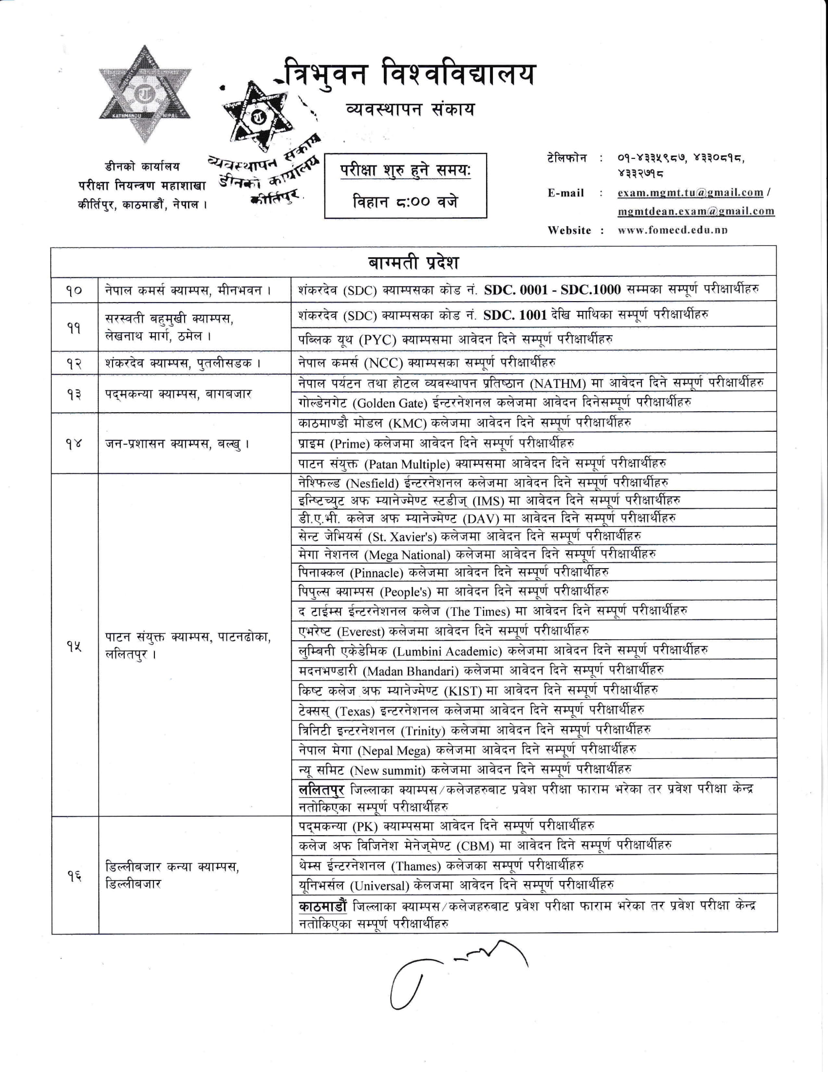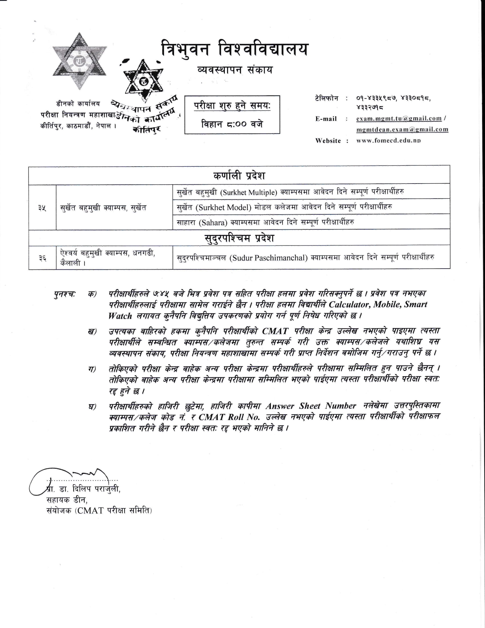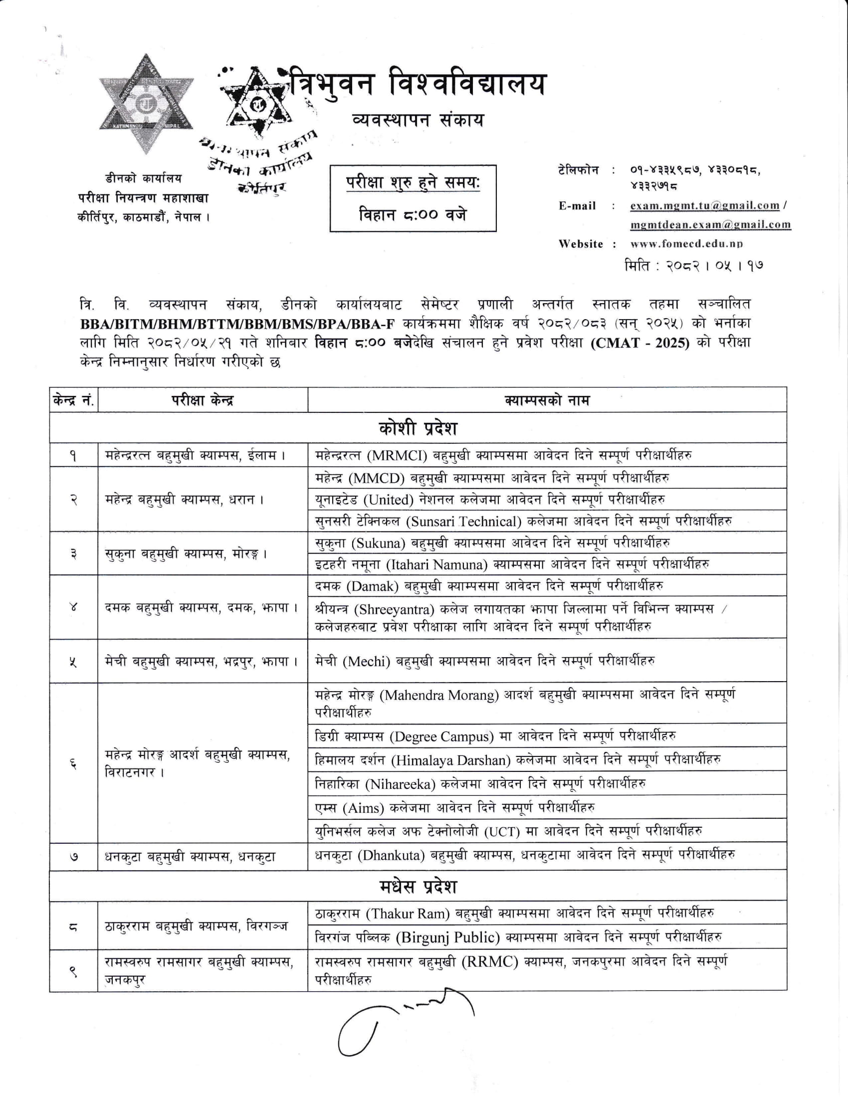 Tribhuvan University, Faculty of Management, Dean's Office, Kirtipur, has published the Central Management Admission Test (CMAT) entrance examination centers for enrollment in the following programs for the academic year 2082/83 (2025).