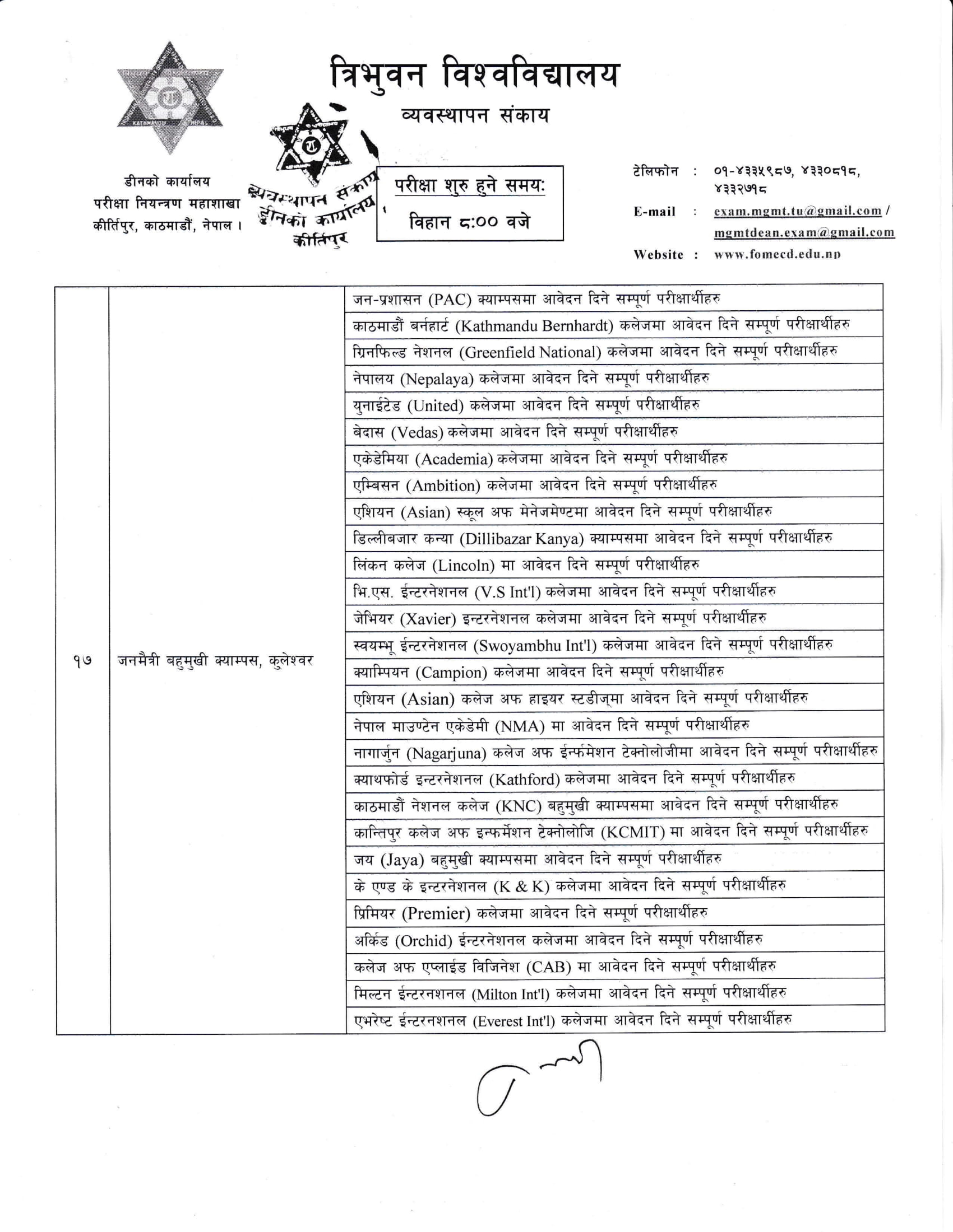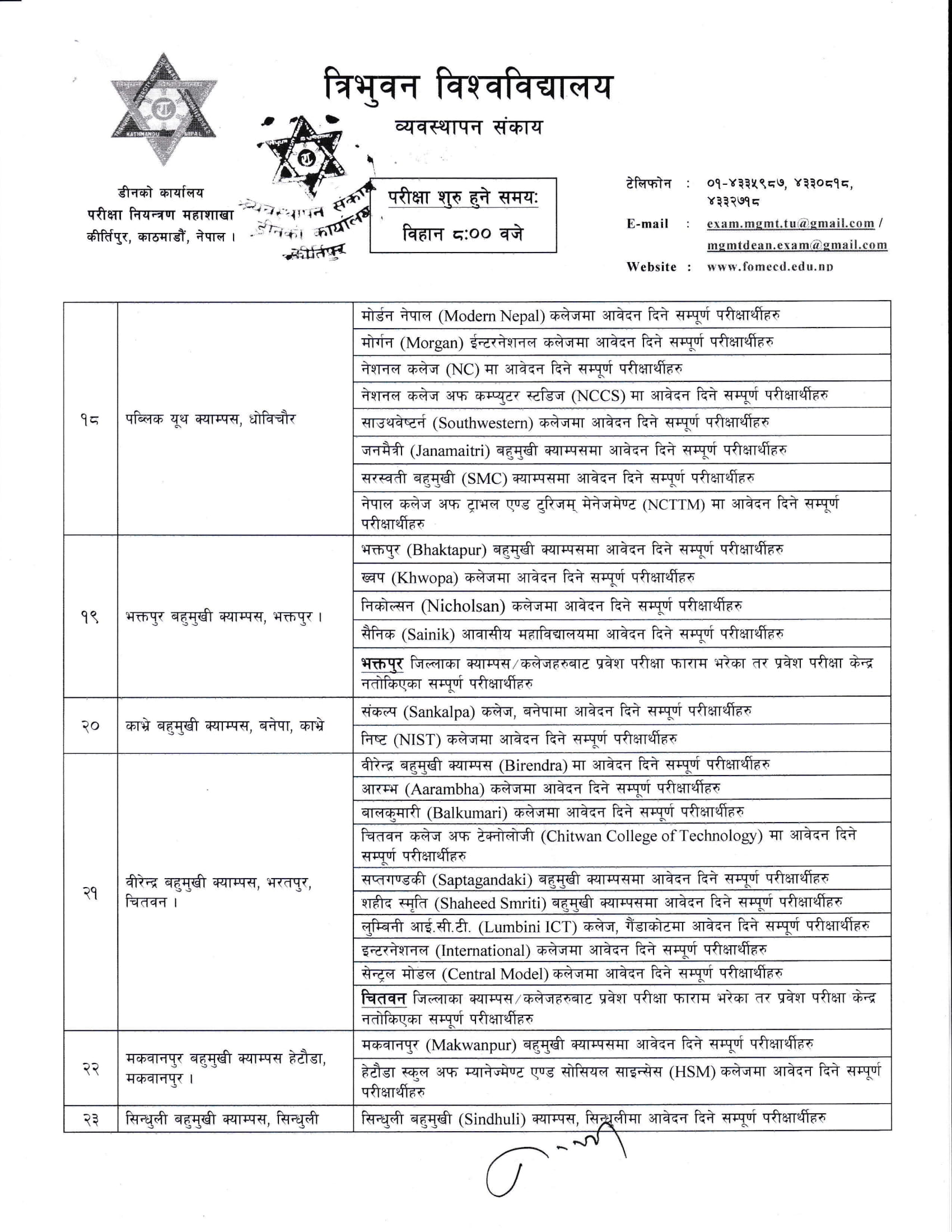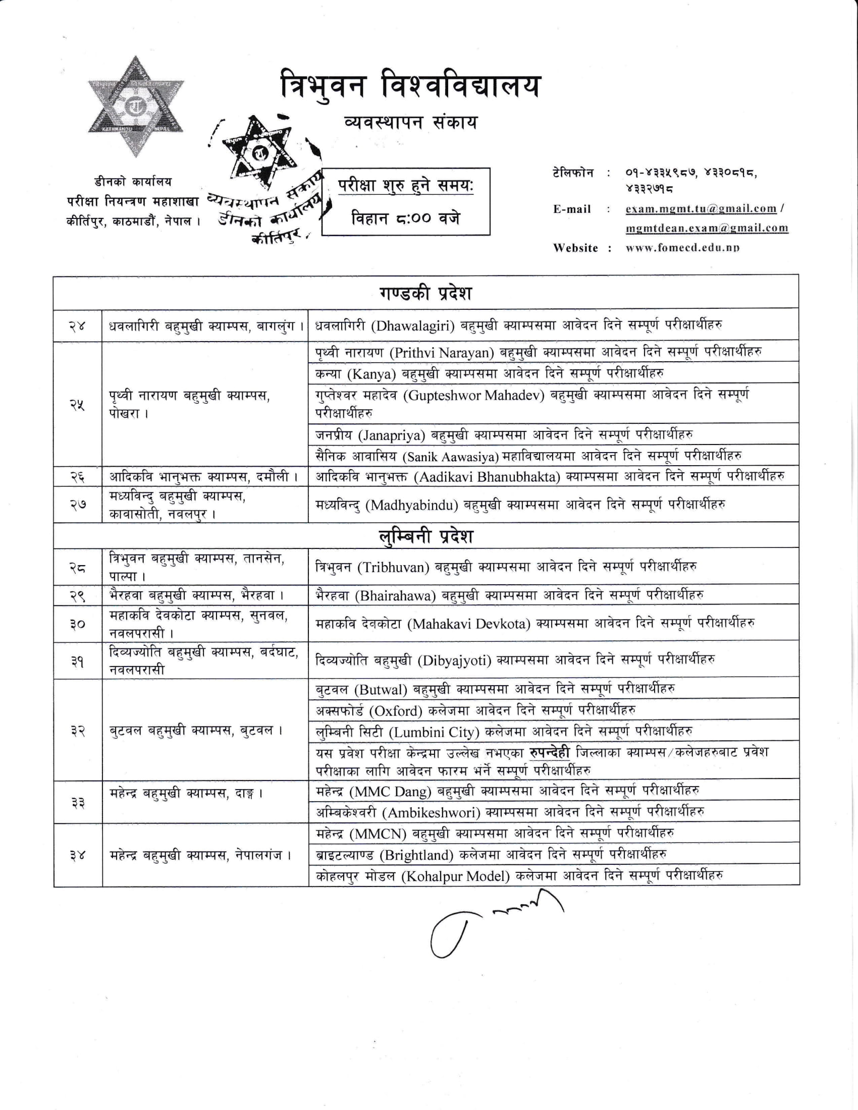 Tribhuvan University, Faculty of Management, Dean's Office, Kirtipur, has published the Central Management Admission Test (CMAT) entrance examination centers for enrollment in the following programs for the academic year 2082/83 (2025).