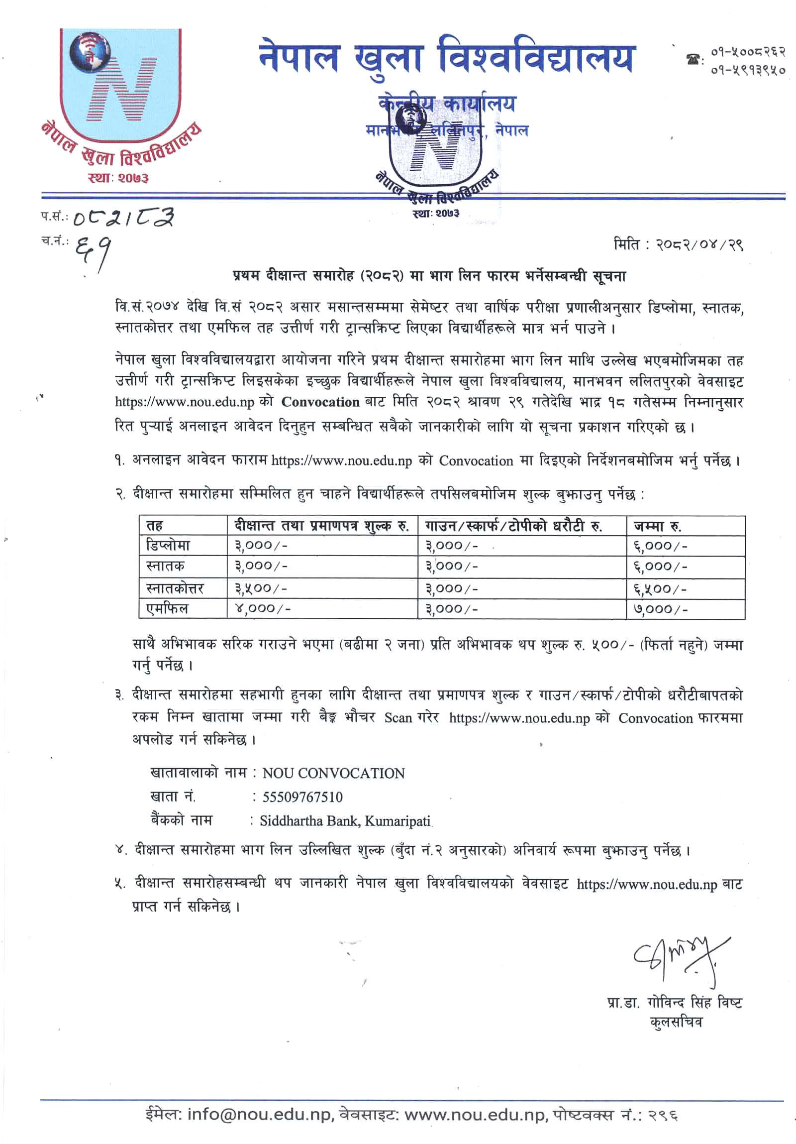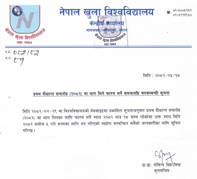 Nepal Open University has extended the deadline for applying for the convocation form to participate in its 1st convocation ceremony to till Ashoj 5, 2082. Interested candidates are requested to fill out the application form online by logging in to the website.