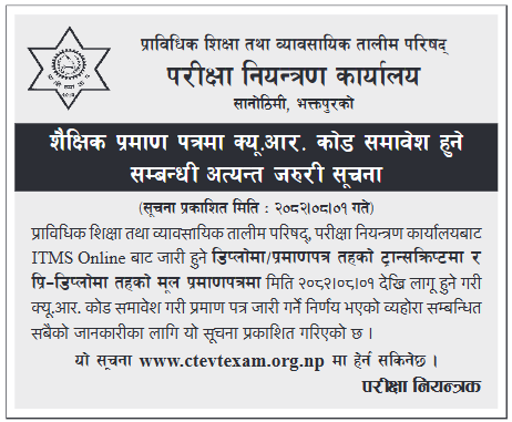 Council for Technical Education and Vocational Training (CTEVT), Office of the Controller of Examinations, Sanothimi, Bhaktapur, has published for the information of all concerned regarding the decision to include a QR code in Transcripts for Diploma/Certificate Level programs and Original Certificates for Pre-Diploma Level programs.