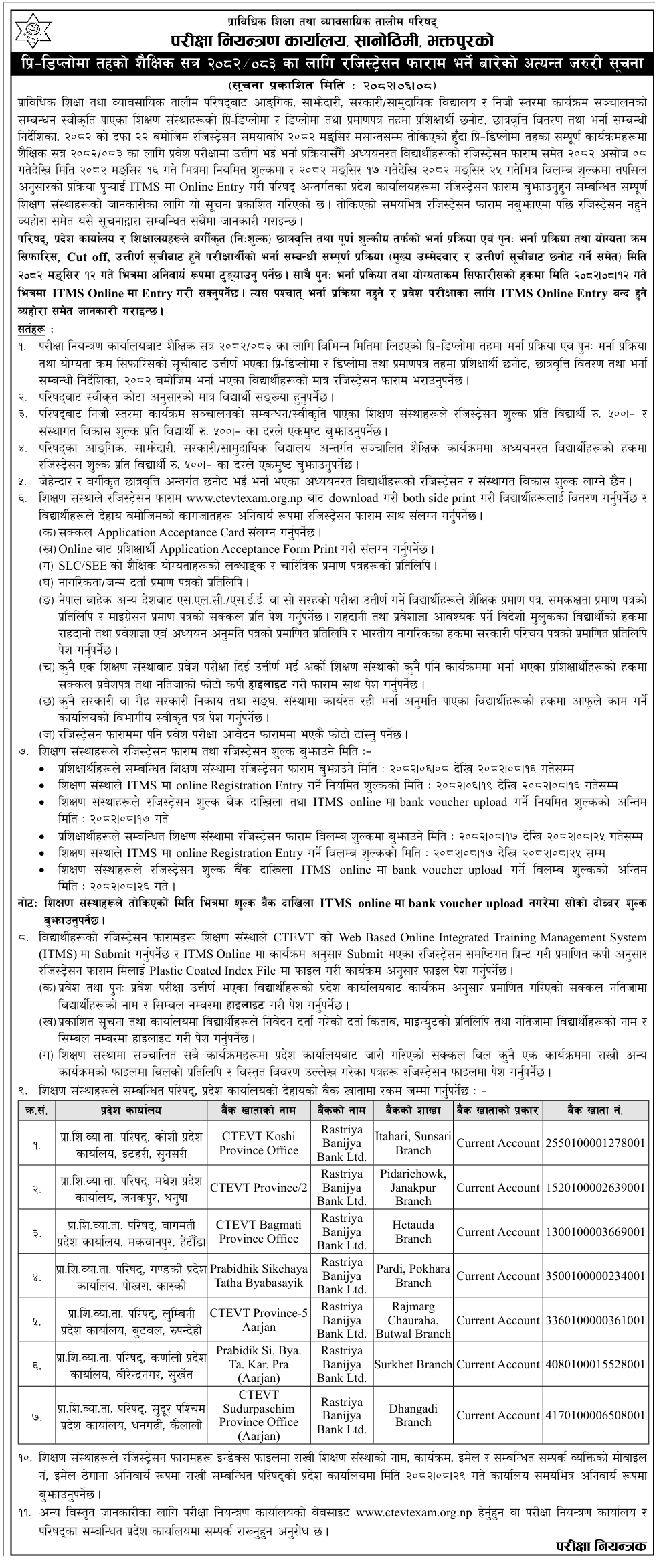 The Council for Technical Education and Vocational Training (CTEVT) notified its affiliated, constituent, and community institutions that run the Pre-Diploma, Diploma/Certificate level programs to send the filled-up registration forms of all programs of the students who have passed the entrance examinations of the Pre-Diploma for the academic year 2082/82 to the Council on the following dates: