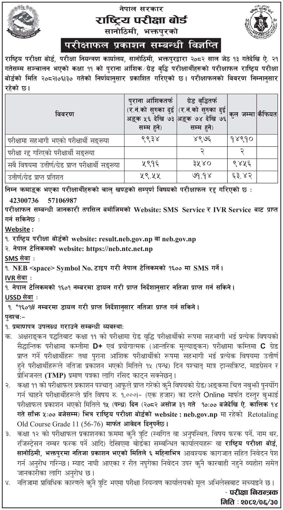 The National Examination Board (NEB), Sanothimi, Bhaktapur, has published the results of the Grade 11 Partial/Grade Increment examination. The grade increment exam of Grade 11 was held on Jestha 13 to 21, 2082. The results have been published as per the decision of the National Examinations Board dated Ashoj 30, 2082.