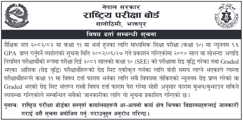 The National Examination Board (NEB), Sanothimi, Bhaktapur has published an updated notice, following the notice published on 2082/06/27 addressing that a candidate must obtain a minimum of 1.6 GPA in the Secondary Education Examination (Class 10) for admission to Class 11 in the academic session 2082/83.