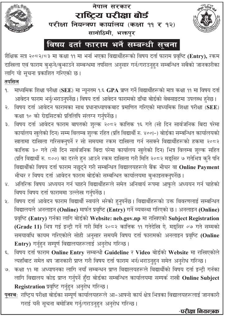 - The Subject Registration Application Form must be filled out by the students themselves. The schools are required to perform the online entry of these details. The arrangement has been made for online entry (Entry) via the Subject Registration (Grade 11) section on the Board's Website: neb.gov.np. All schools are requested to complete the online entry (Online Entry) of the Subject Registration Form accordingly and on time, from Kartik 11, 2082 until Mangsir 07, 2082.