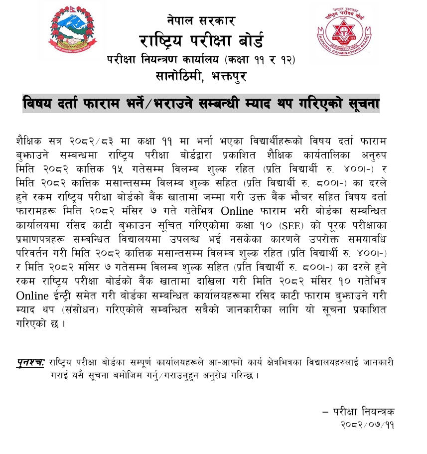 This decision was made after the original deadline could not be met due to delays in schools receiving the Grade 10 (SEE) supplementary examination mark sheets. Previously, NEB had set the deadline without a late fee till Kartik 15 and with a late fee till Kartik 30.