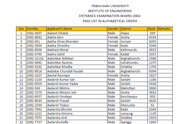 Tribhuvan University, Institute of Engineering, Entrance Examination Board published the results of BE/B.Arch Entrance examination which was held from Bhadra 03 to Bhadra 10. IOE Entrance Examination Board has published the pass list in alphabetical order for 6617 candidates and expelled one applicant.