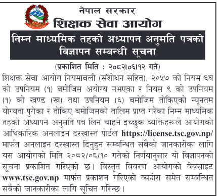Government of Nepal, Teachers Service Commission, Sanothimi, Bhaktapur has published applications for eligible Nepalese candidates for teaching licenses of lower secondary level. Applications must be filled out ONLINE.