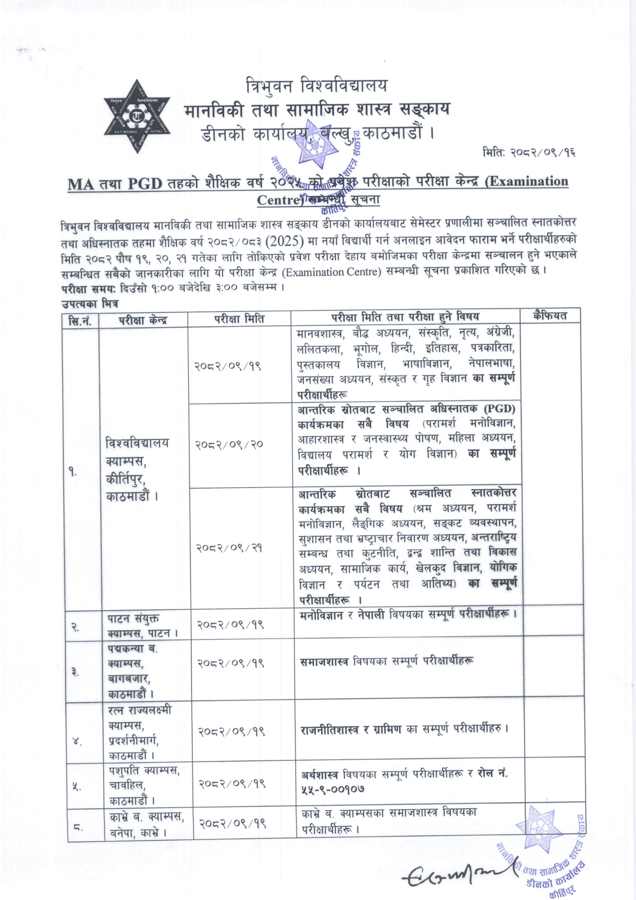 Tribhuvan University, Faculty of Humanities and Social Sciences, Dean's Office, Balkhu, Kirtipur, publishes the entrance examination center for the upcoming MA and PGD entrance examinations.