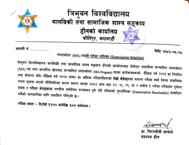 Tribhuvan University, Faculty of Humanities and Social Sciences, Dean's Office, has announced a new schedule for its postponed postgraduate (MA) examinations. The university has now rescheduled the MA third-semester examination for regular (academic year 2023) and partial (academic year until 2020) students.