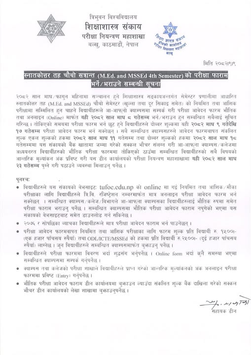 Tribhuvan University (TU), Faculty of Education, Examination Control Division, has released the exam form fill-up notice for the M.Ed. and MSSEd fourth semester 2082. The notice applies to regular students, partial examinees, and those enrolled in Open and Distance Learning (ODL) programs.