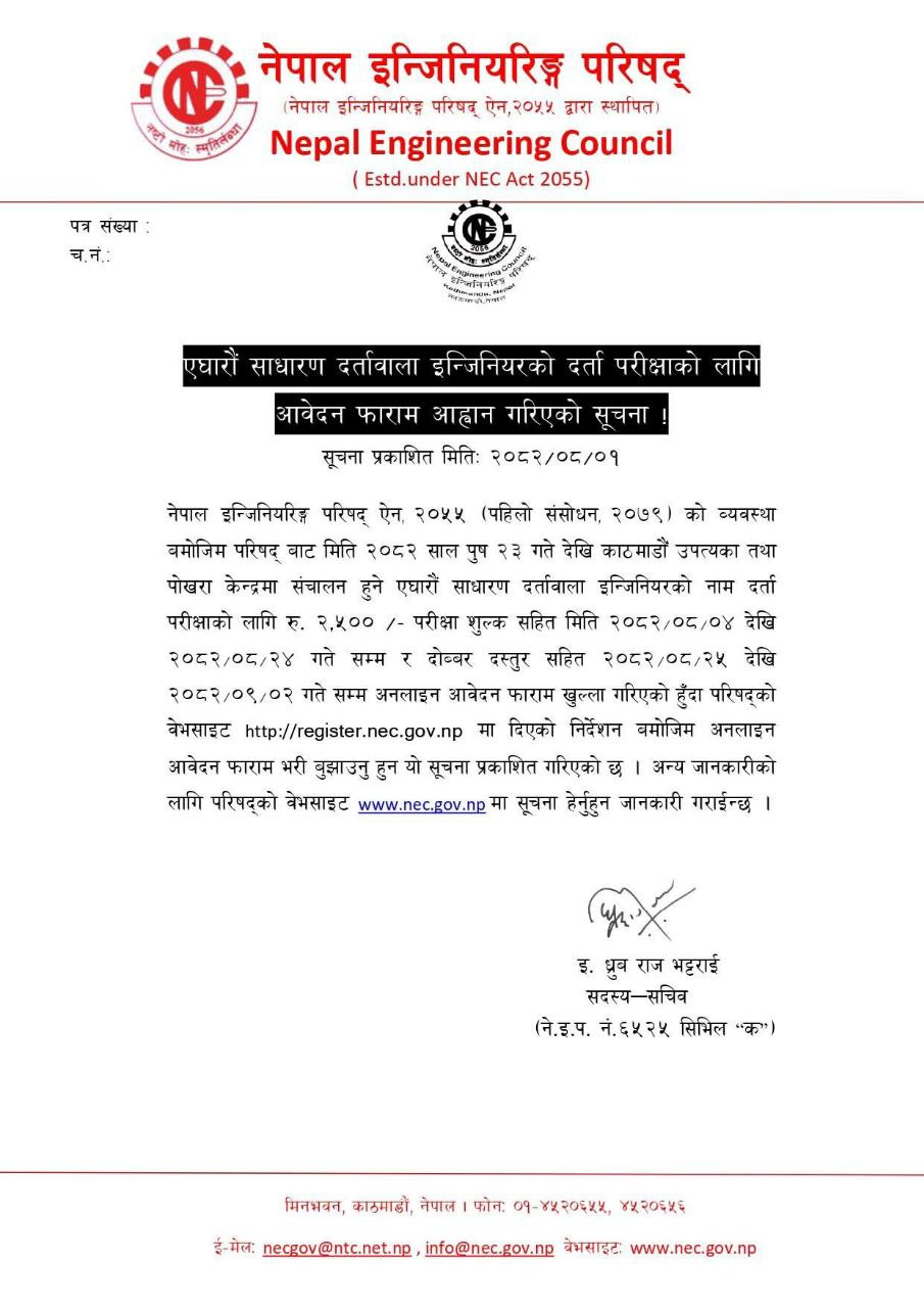 The Nepal Engineering Council (NEC) has announced the opening of applications for for engineers aspiring to attain the status of 11th General Registered Engineer, in accordance with the Nepal Engineering Council Act, 2055, as amended in 2079.