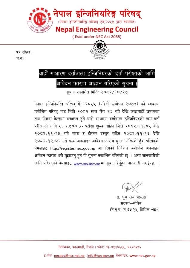 The Nepal Engineering Council (NEC) has announced the opening of applications for the 12th Engineering Registration Examination for engineers aspiring to attain the status of the General Registered Engineer, in accordance with the Nepal Engineering Council Act, 2055, as amended in 2079.