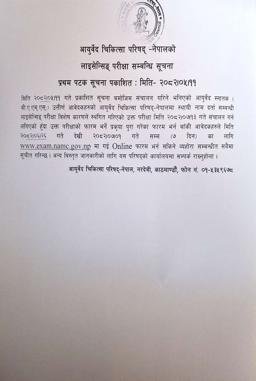 The Nepal Ayurvedic Medical Council has announced the new date for the licensing examination, which had been postponed as follows: