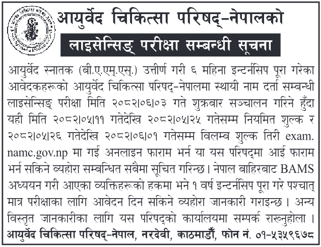 The Nepal Ayurvedic Medical Council has announced the upcoming licensing examination for applicants who have completed a Bachelor of Ayurvedic Medicine and Surgery (BAMS) and a 6-month internship under the Council. This examination is crucial for those seeking permanent registration with the council.