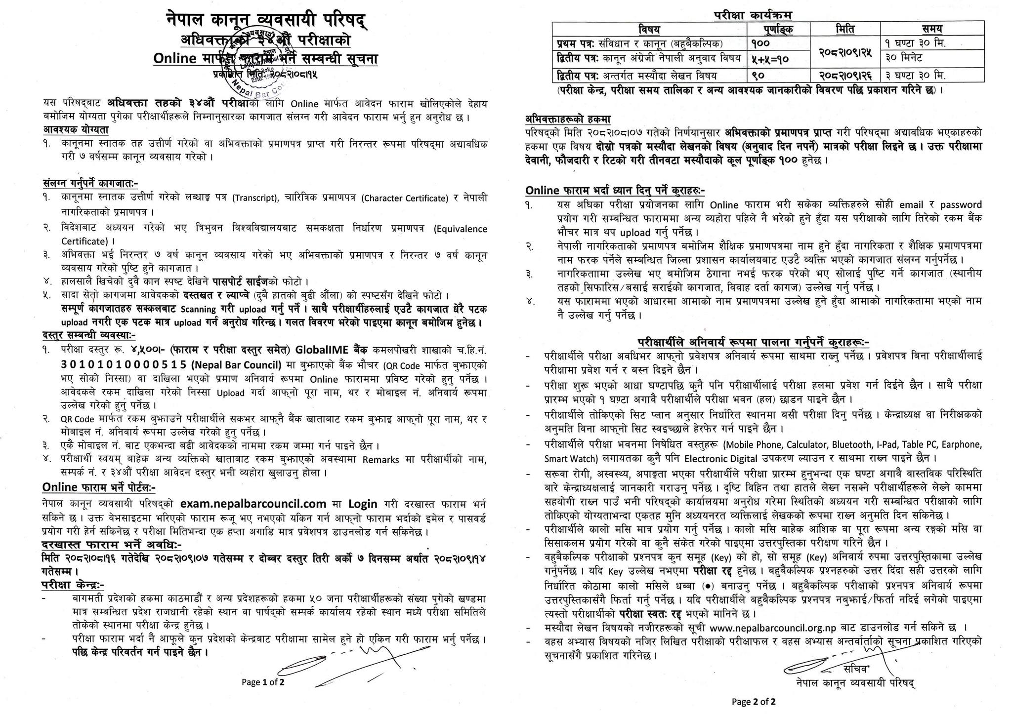 The Nepal Bar Council has announced the opening of online applications for the 34th Advocate Level Examination. Eligible candidates meeting the required qualifications are invited to apply through the official online portal.