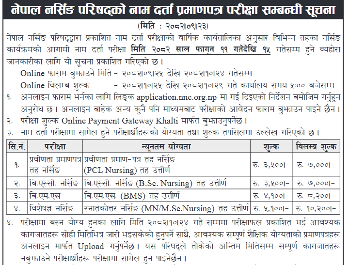 The Nepal Nursing Council (NNC) has officially announced the date for the Name Registration Certificate Examination 2082, scheduled for Falgun 11 to Falgun 19, 2082. This notice is intended to inform all interested candidates of the examination details and the necessary steps for registration.