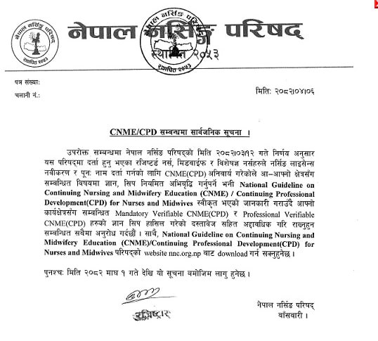 The Nepal Nursing Council (NNC) has introduced a new provision requiring nurses and midwives to complete mandatory training hours before renewing their licenses. The policy, which will take effect from Magh 1, 2082, makes Continuing Professional Development (CPD) a compulsory component of license renewal.