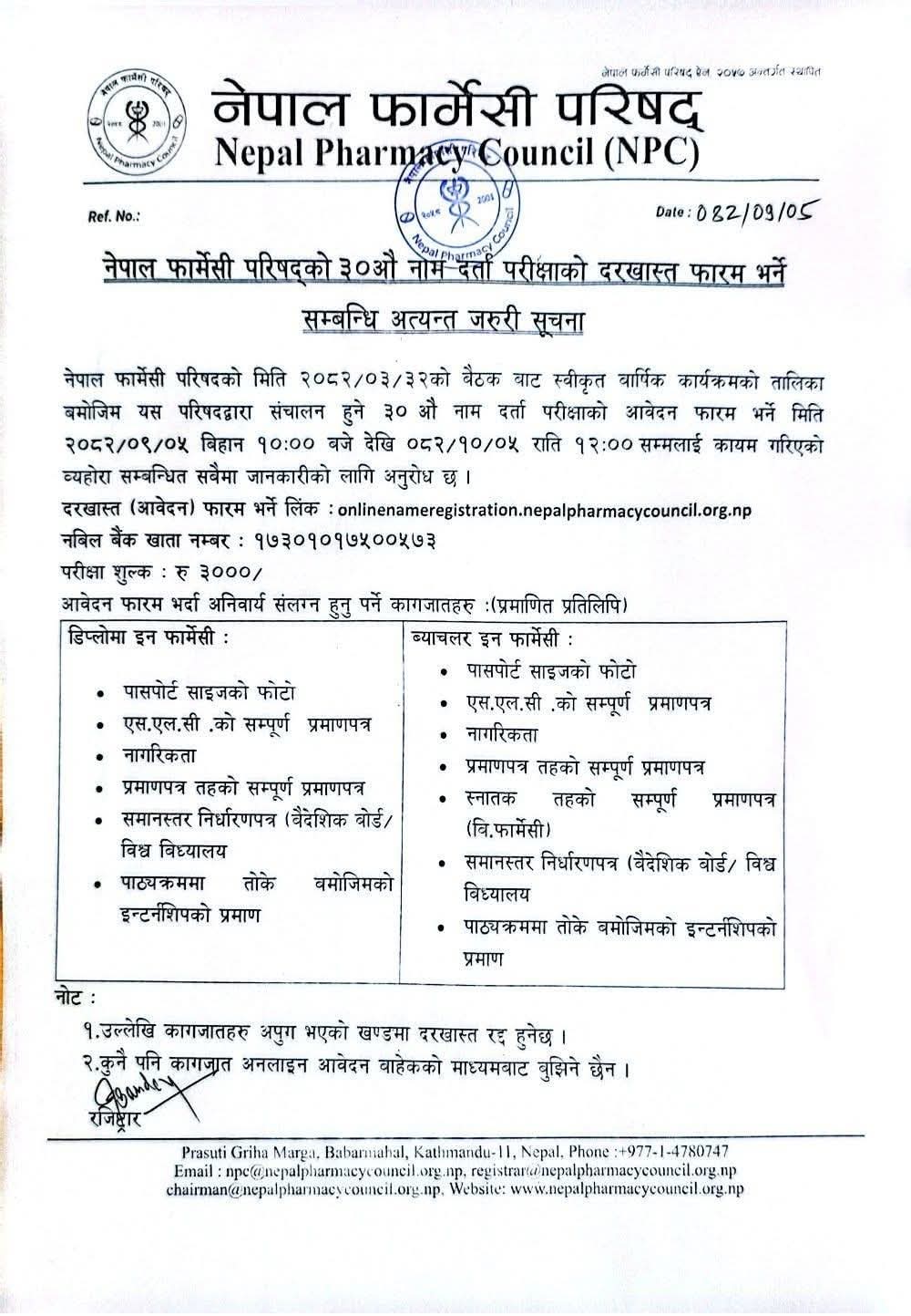 - Online Registration Link: : onlinenameregistration.nepharmacycouncil.org.np.