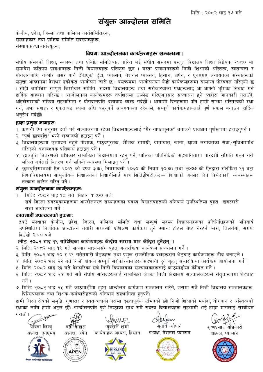The joint statement was issued with the approval of the committee members, including Pawitra Limbu, President of NMA, Badri Dahal, President of APEN, Yuvraj Sharma, Acting President of HISSAN, Subash Neupane , President of National PABSAN, and Krishna Prasad Adhikari, President of PABSON. They pledged to conduct the movement in a disciplined, restrained, and powerful manner, clarifying that they stand firmly for the prosperity, quality, and autonomy of the education sector and will not compromise on protecting the dignity and contributions of private education.