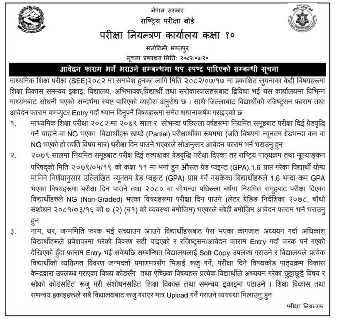 The National Examinations Board (NEB), through its Office of Controller of Examination( Grade 10) in Bhaktapur, has issued a detailed clarification regarding the filling out the application form of Secondary Education Examination (SEE) for the upcoming 2082 examinations. The notice specifically targets both regular examinees and those appearing for partial or subject grade increment examination.
