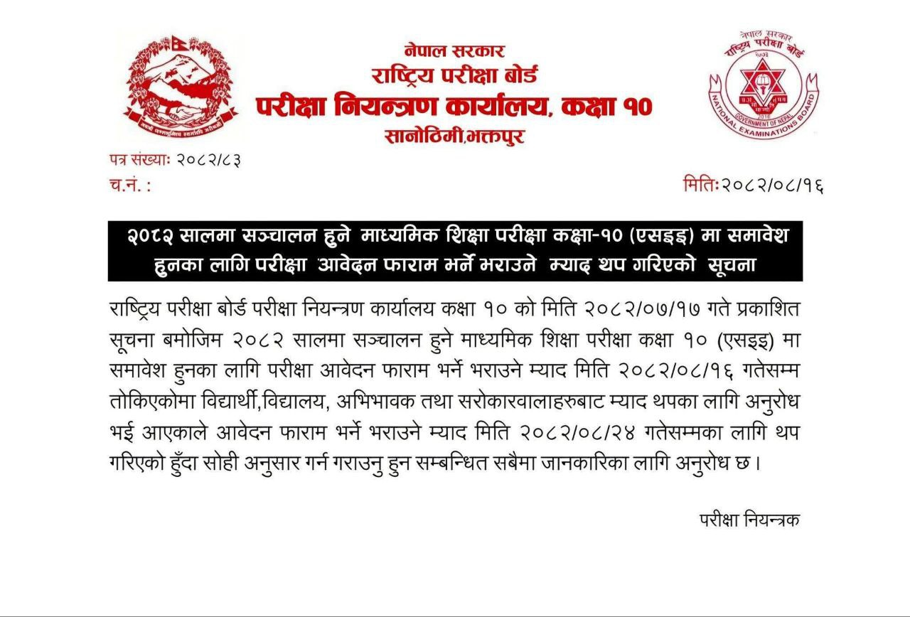 The National Examination Board (NEB), Office of Controller of Examination( Grade 10), has extended the deadline for submitting the Secondary Education Examination (SEE) 2082 application form.