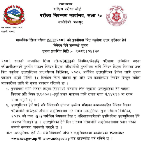 The National Examination Board (NEB) has announced that students who are not satisfied with the results of the Secondary Education Examination (SEE) 2081, even after re-totaling, can apply to view their answer sheets.