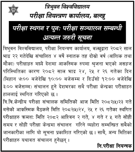 Tribhuvan University, Office of the Controller of Examinations, Balkhu, has postponed the examinations for the four-year Bachelor's Second Year (Partial and Chance) that were scheduled to be held on Bhadra 24, 25, and 26, 2082. The exams were to run from 7:00 a.m. to 10:00 a.m. and 12:00 p.m. to 3:00 p.m.