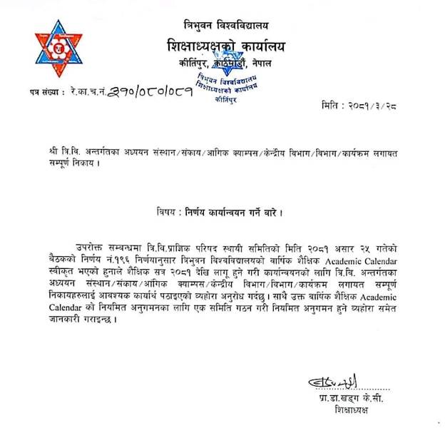 The Office of the Academic Registrar issued a formal notification on the 28th of Ashadh, 2081, instructing the concerned bodies (All Institutes / Faculties / Constituent Campuses / Central Departments / Departments / Programs and all other bodies) under Tribhuvan University to ensure the seamless implementation of the new calendar.