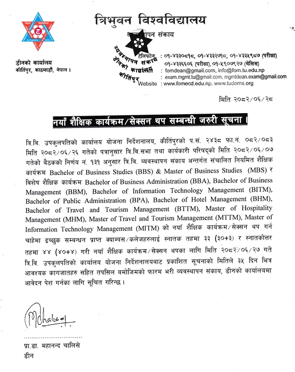 Tribhuvan University’s Faculty of Management ( TU, FoM) has issued a notice calling on its affiliated campuses and colleges to apply for the addition of new academic programs and sections for the upcoming academic year.
