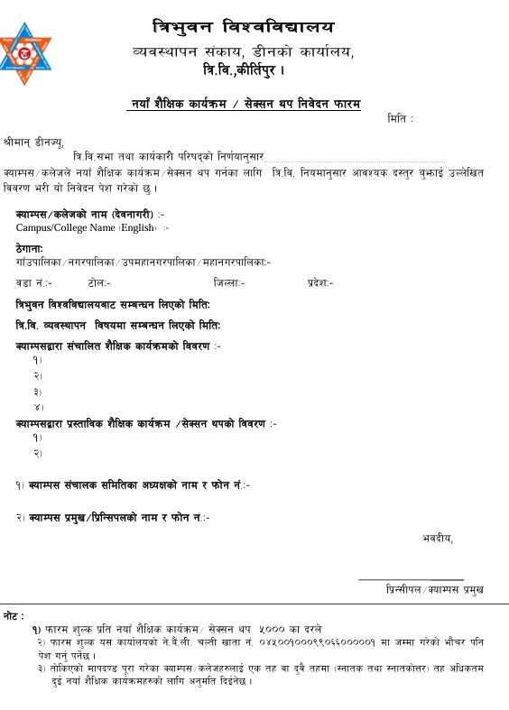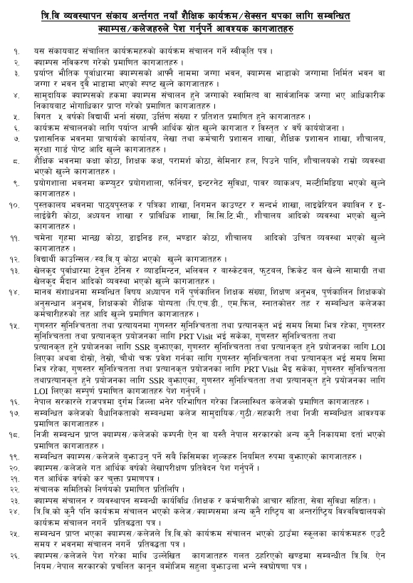 According to the decision made by the TU Vice-Chancellor’s Planning Directorate (Ref. No. 2438, dated 2082/06/2) and endorsed by the TU Senate and Executive Council meeting held on 2082/06/07, affiliated colleges are invited to submit applications within 35 days from the date of the notice for the addition of new programs issued on Ashoj 27, 2082 from the directorate.