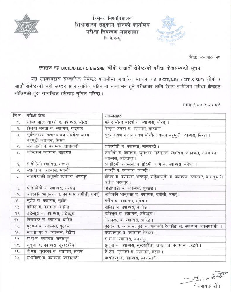 The Office of the Dean, Faculty of Education, Tribhuvan University, has published the exam centers for the upcoming BICTE/B.Ed. (ICTE & SNE) fourth and seventh semester examinations. The exams are scheduled to be held in Kartik 2082.