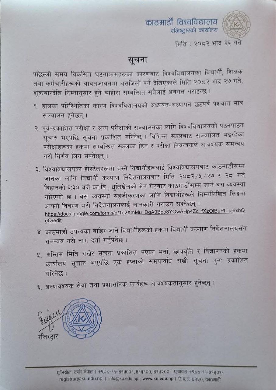 The university has also arranged transportation for students residing in university hostels to travel from main gate of the university at Dhulikhel to Kathmandu from 6:30 AM on Bhadra 27 and 28. For this, students are required to register their details via the provided online form on the notice. Students traveling outside the Kathmandu Valley are advised to coordinate and register with the Directorate of Student Welfare.