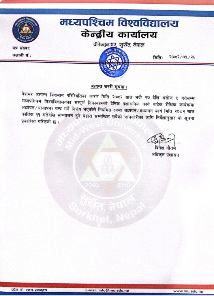 Mid-West University has also decided to resume its academic activities after Chhath. However, all its daily administrative activities will be continued from Bhadra 27 to Ashoj 5, 2082.