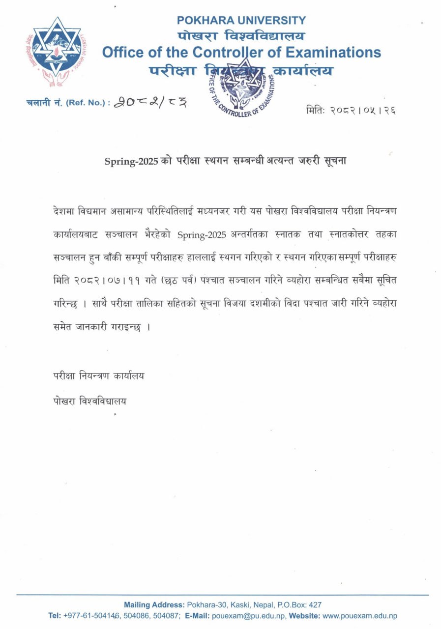 Also, Pokhara University has postponed all remaining Spring 2025 undergraduate and postgraduate examinations until after the Chhath festival. The revised schedule will be published after the Dashain holidays.