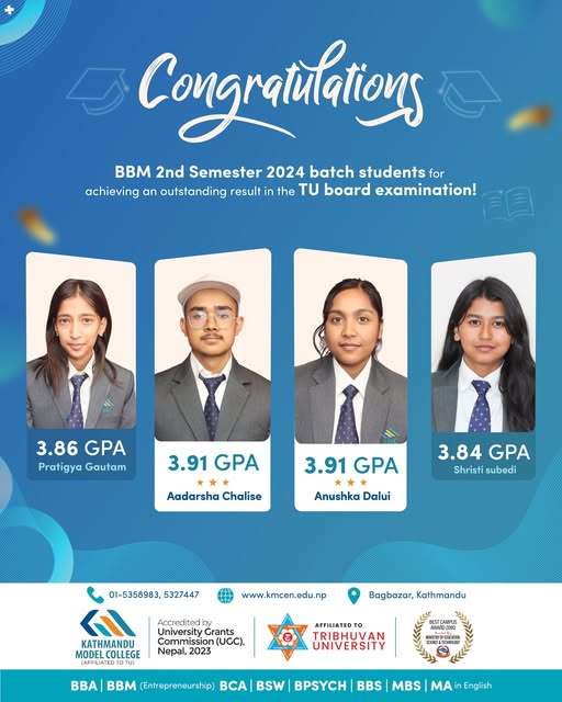 Kathmandu Model College (KMC) has once again continued its proud tradition of academic excellence by securing outstanding results in the BBA Second Semester Board Examination conducted under Tribhuvan University.