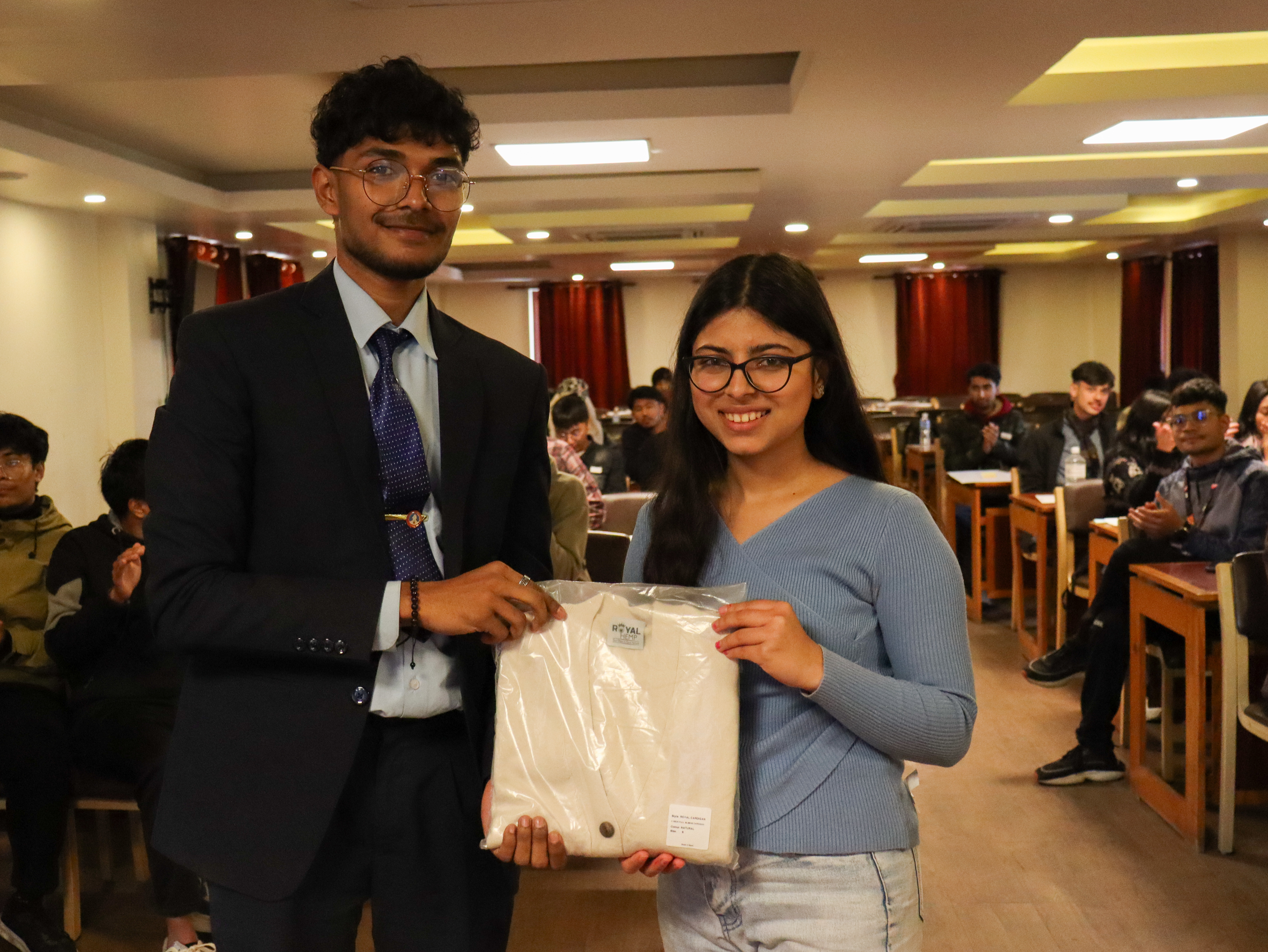 Campus Director Mr. Rohan Singh presented a Token of Love to Mr. Adarsha Shrestha, acknowledging his expertise and invaluable contribution to equipping students with powerful business planning frameworks. Winners of BMC Bingo and Idea Tinder activities received their prizes, with additional participants selected through the Spin the Wheel receiving exciting rewards.