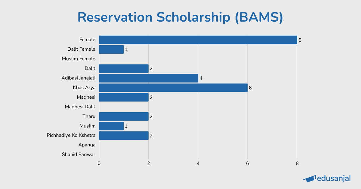 The government of Nepal allocates 110 seats for candidates who want to pursue BAMS in Nepal. In 2024, the government allocated 63 scholarship seats for students who wish to study BAMS in Nepal.