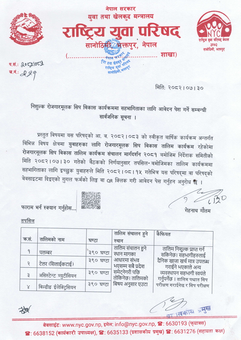 The National Youth Council (NYC), under the Government of Nepal, Ministry of Youth and Sport, has invited applications for free job-oriented skill development training. Interested candidates wishing to participate in the training must submit their applications according to the following details: