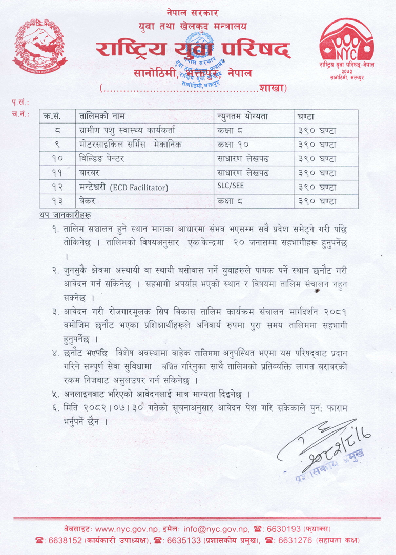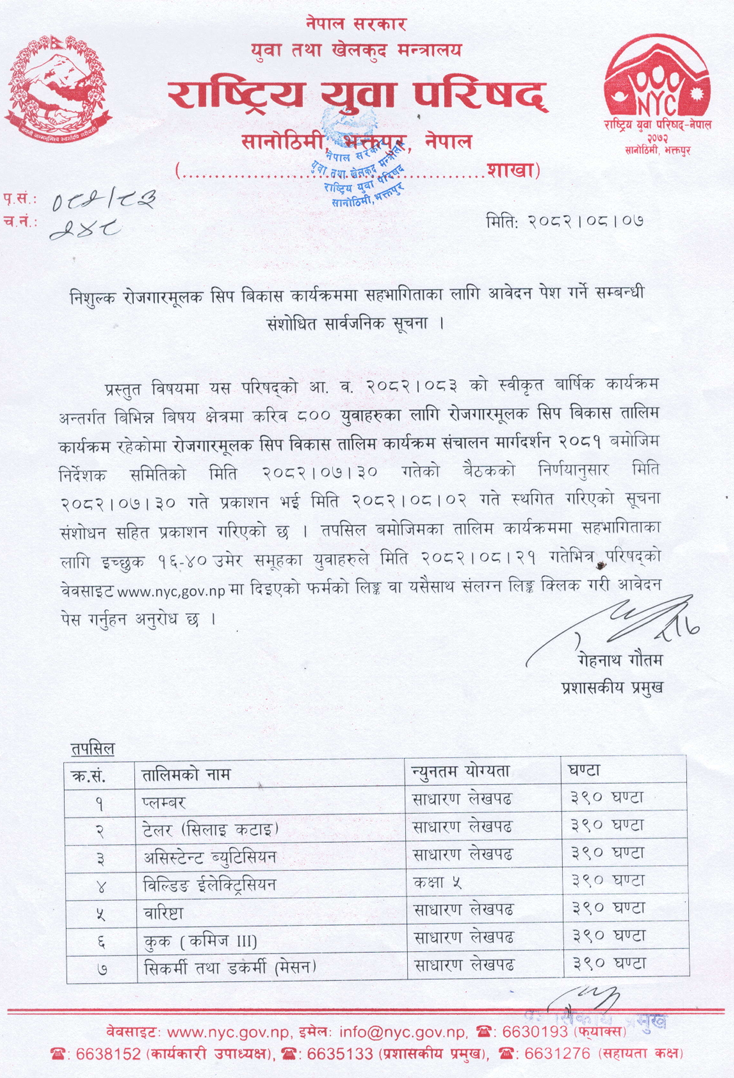The National Youth Council (NYC), under the Government of Nepal, Ministry of Youth and Sports, has issued a revised notice extending the deadline for free job-oriented skill development training.