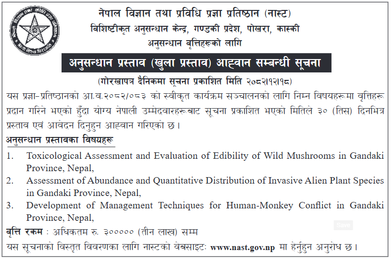 Specialized Research Center, Nepal Academy of Science and Technology (NAST), Gandaki Province, Pokhara, Kaski, has published a notice regarding a call for research proposals. To operate the approved programs of this Academy for the Fiscal Year 2082/083, research fellowships will be provided in the following subjects. Qualified Nepali candidates are invited to submit their proposals and applications within 30 (thirty) days from the date of this notice publication.